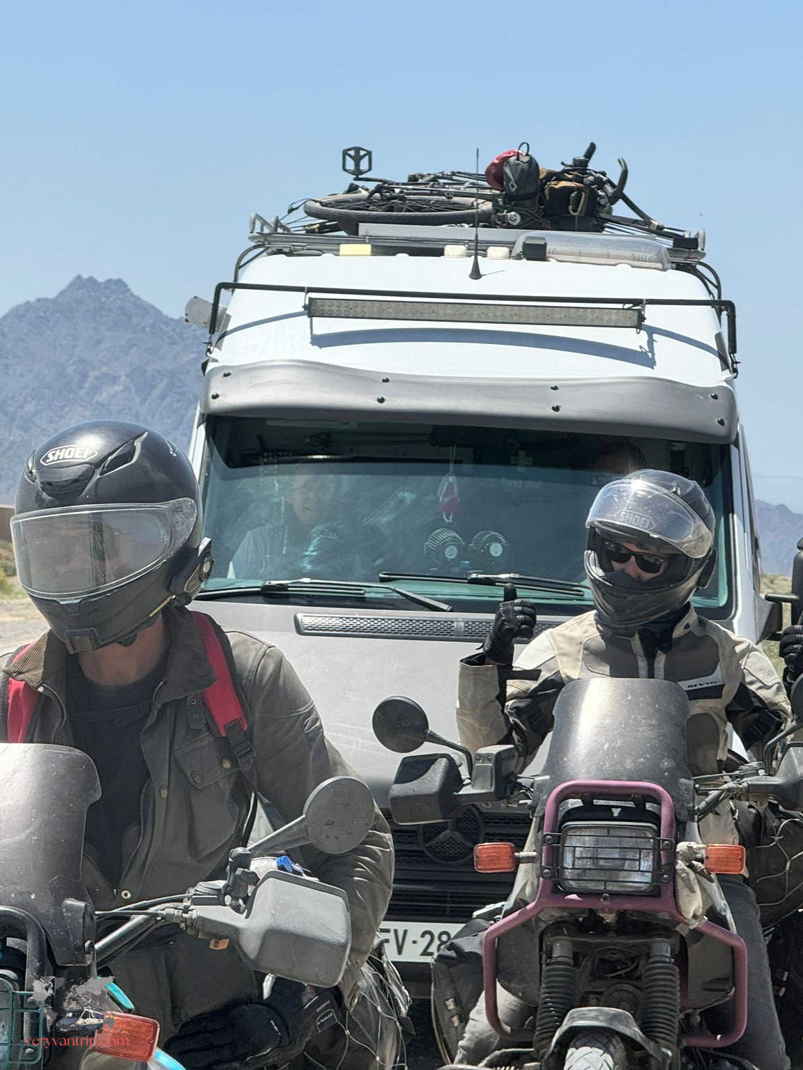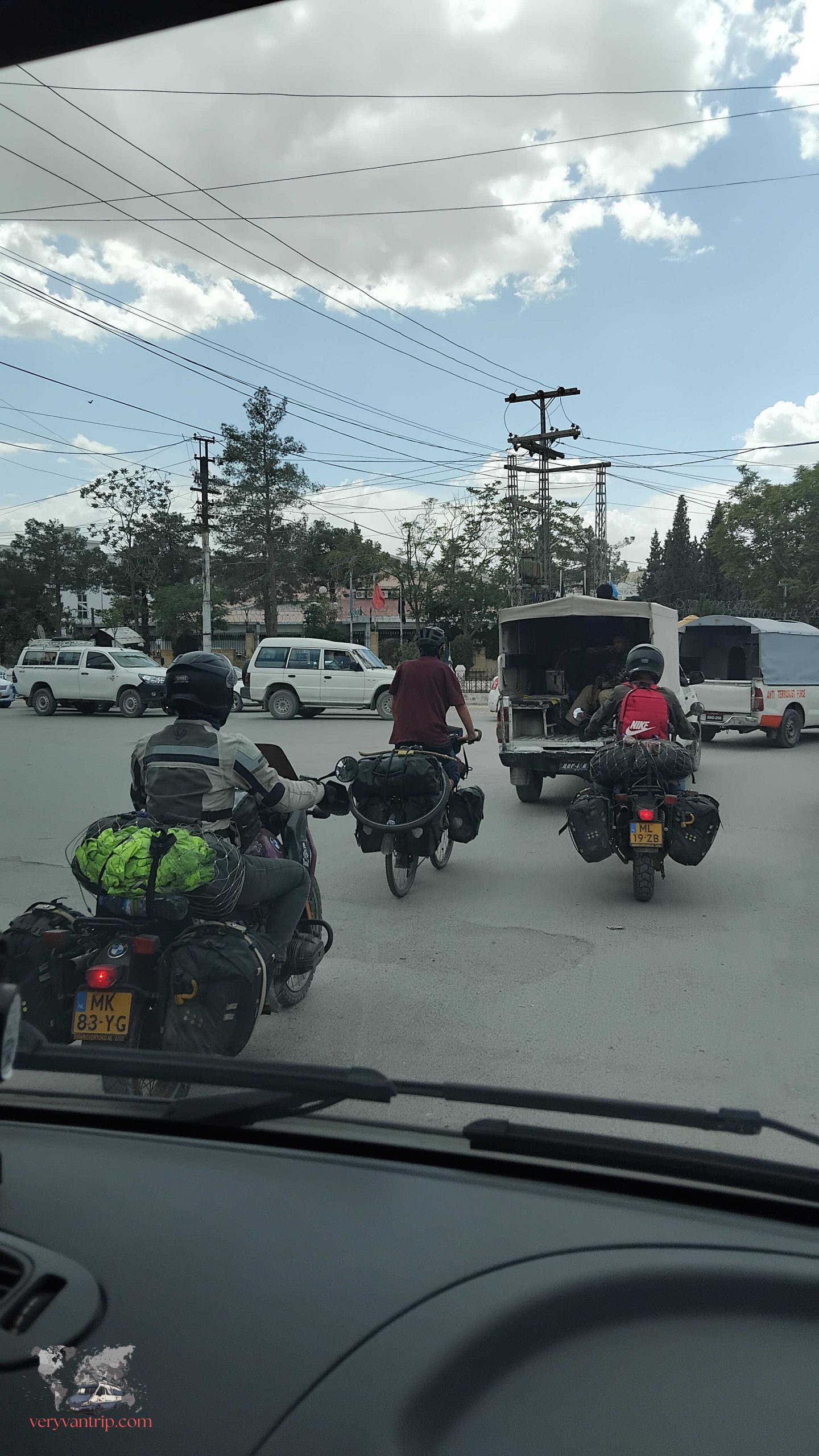 Au bout de deux heures nous revoyons nos deux compagnons de route revenir avec un pickup et sans savoir pourquoi, ils continuent la route avec nous. Alex est même obligé de monter sur son vélo et suivre l’escorte au milieu d’une circulation plus que chaotique.