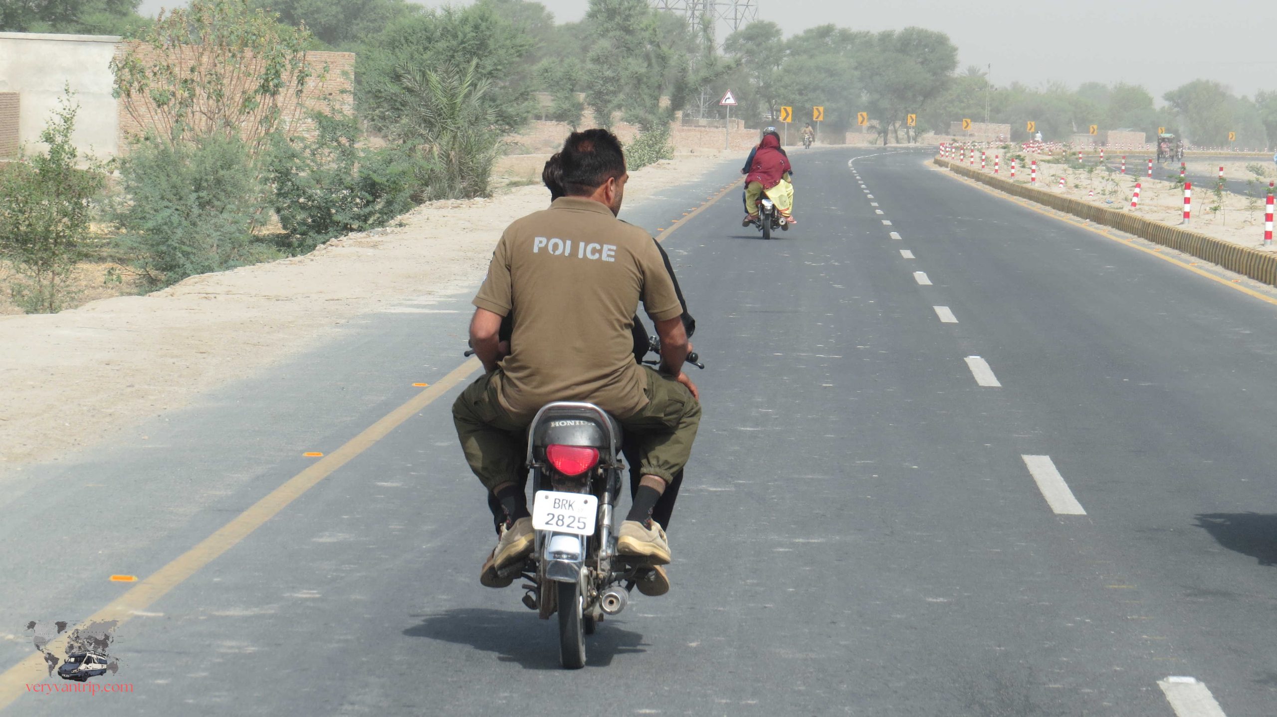Pour finir ce chapitre sur notre passage au Balouchistan, le lendemain nous avions interdiction de reprendre la route vers Lahore sans notre escorte. Nous sommes autorisés à ne plus avoir la police que si nous empruntons l’autoroute, mais par malchance pour notre couple d’Hollandais les motos sont interdites sur ces routes c’est donc encore sur plus de 700 kms qu’ils devront supporter les nombreuses relèves pour enfin être libres.