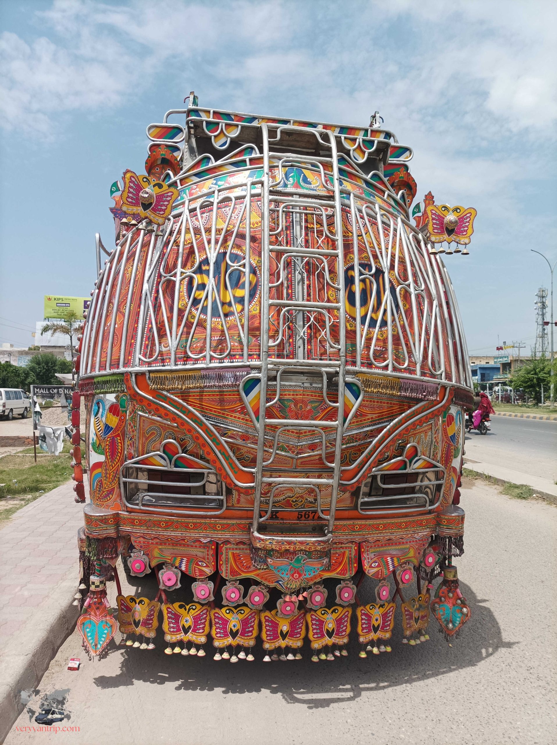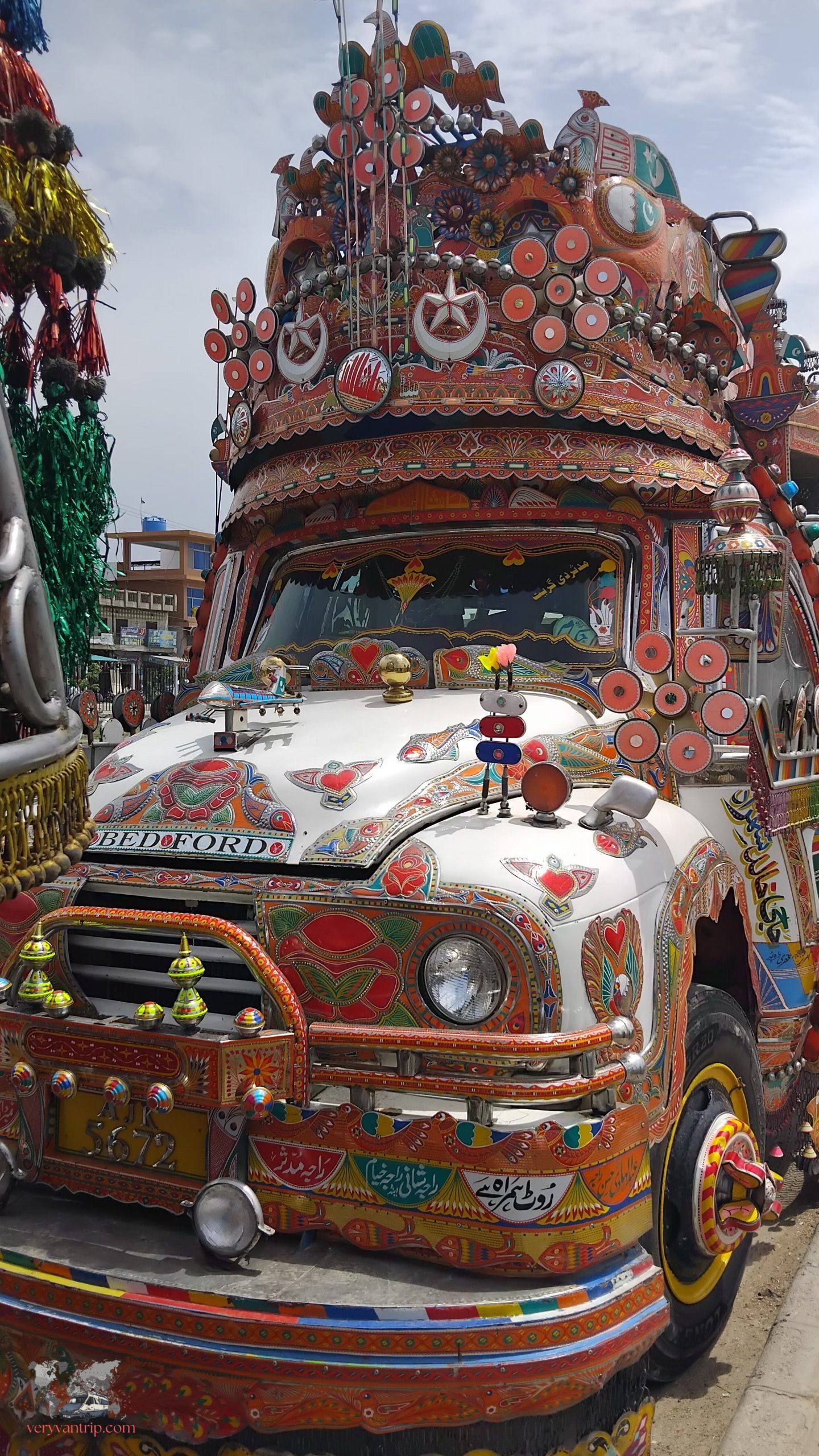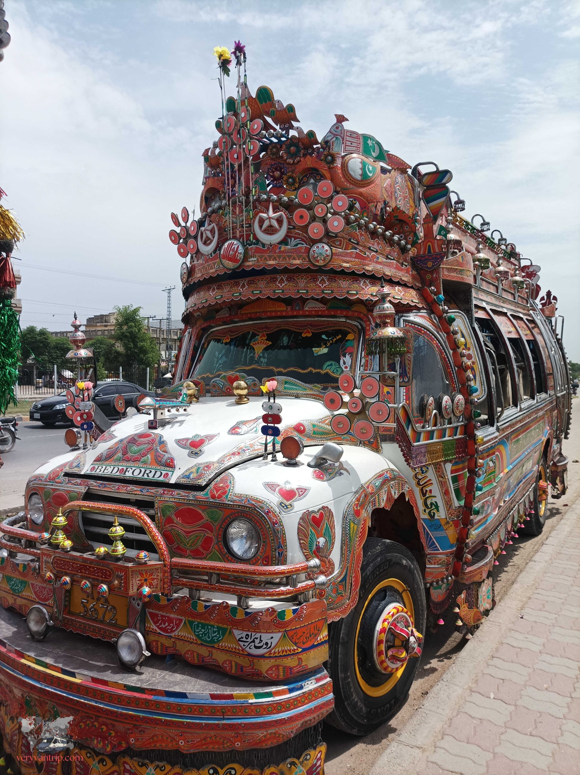 Dans les années 1930, les camions Bedford envahissent les routes du pays. À l’origine, chaque entreprise y peignait simplement son logo pour être facilement identifiable. Puis, au fil du temps, les décorations se sont multipliées, jusqu’à recouvrir chaque centimètre de carrosserie. Aujourd’hui, ces camions sont de véritables œuvres d’art roulantes. Plus le design est extravagant, plus il est censé porter chance aux affaires. Certains chauffeurs dépensent jusqu’à deux ans de salaire pour embellir leur véhicule. Une véritable industrie, qui fait désormais vivre plus de 50 000 personnes au Pakistan.