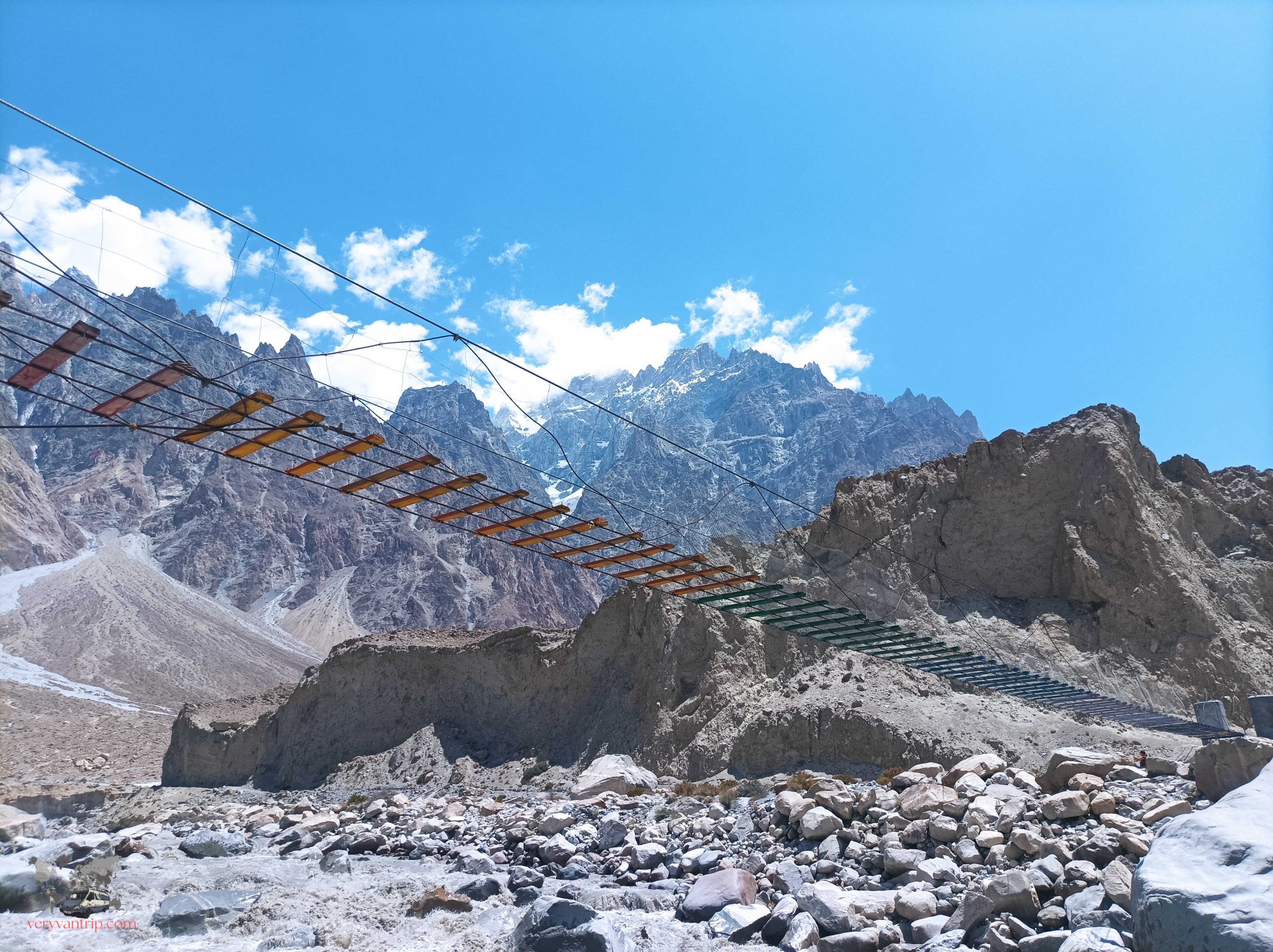 Les vallées du nord du Pakistan regorgent de trésors naturels. Malheureusement, sans 4×4, impossible d’explorer chaque recoin. Mais certaines merveilles restent accessibles, et nous profitons de magnifiques randonnées le long des glaciers, traversons d’impressionnants ponts suspendus ou prenons simplement le temps de nous poser pour admirer tout ce que la nature nous offre.