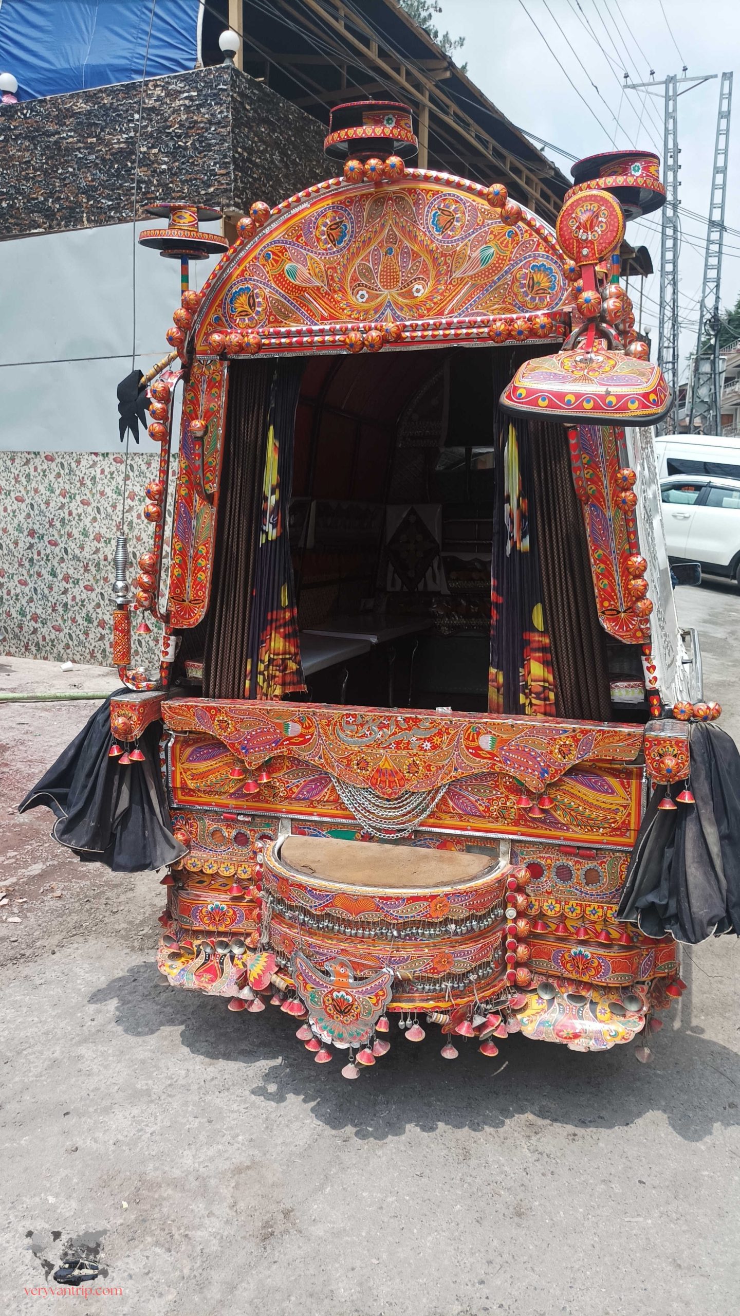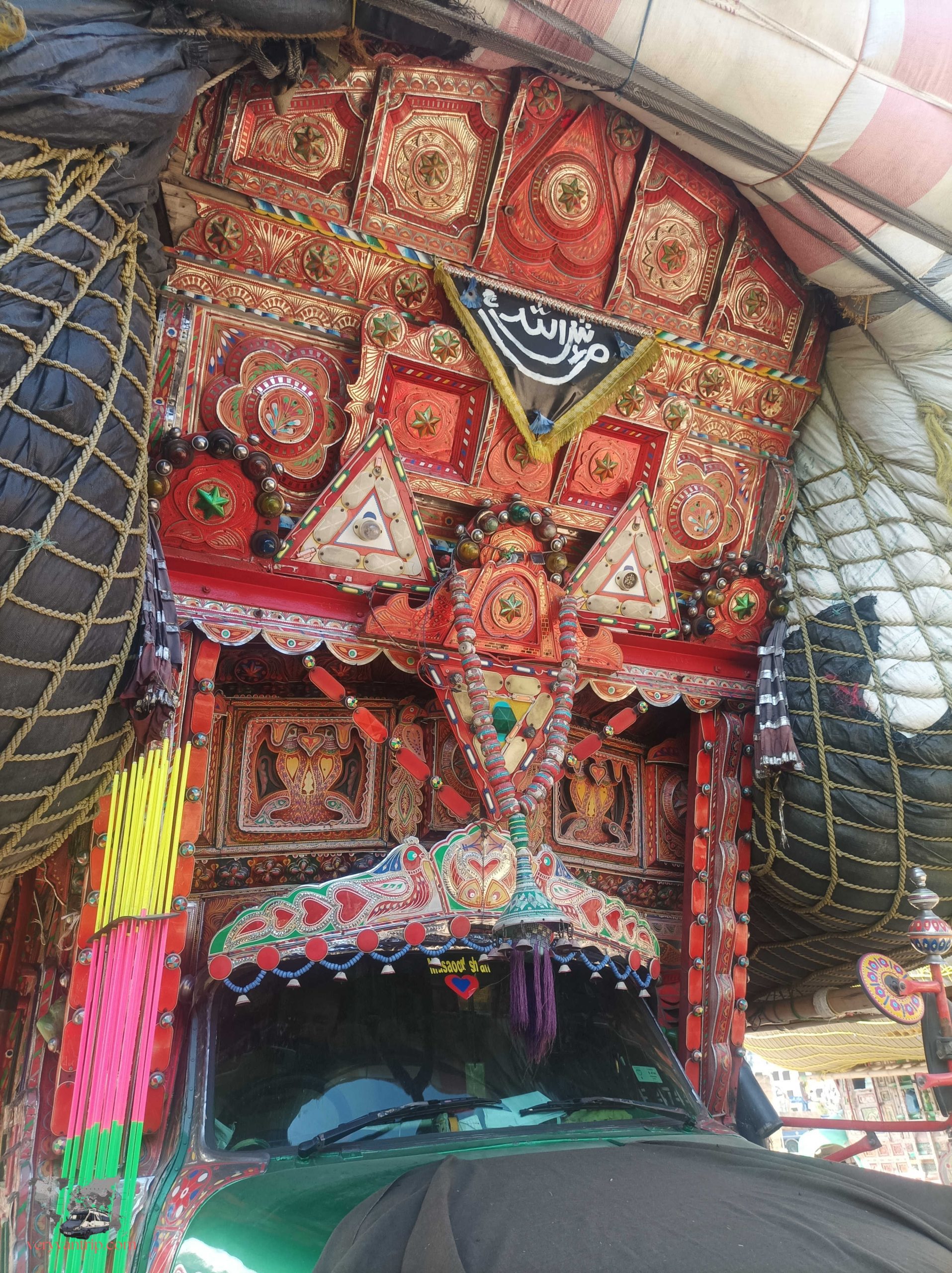 De bas en haut, les camions sont une véritable explosion de couleurs. Les panneaux, richement peints, affichent des mosaïques d’oiseaux, de saints, d’acteurs ou de simples scènes de vie, rappelant le village ou les origines du conducteur.