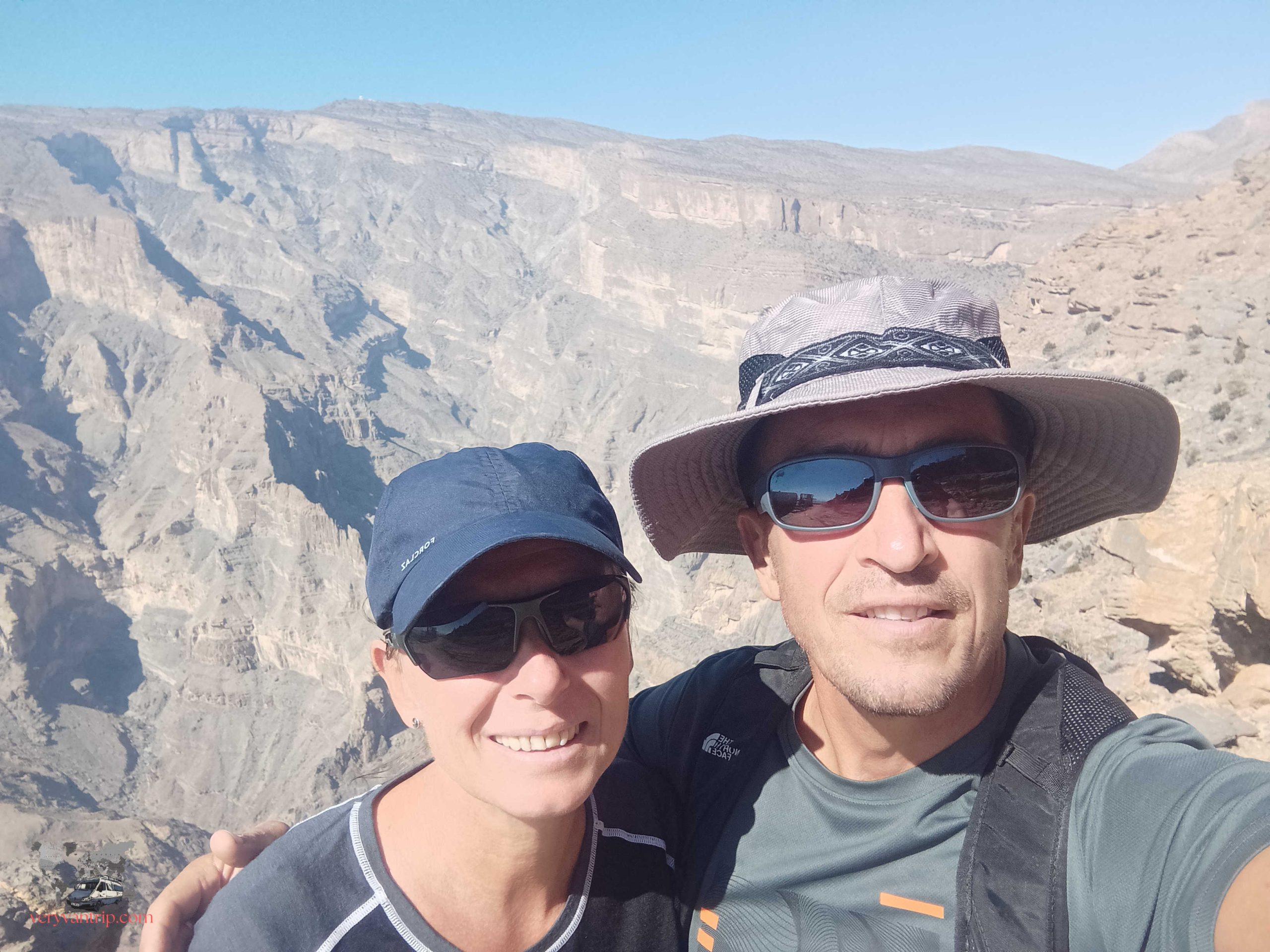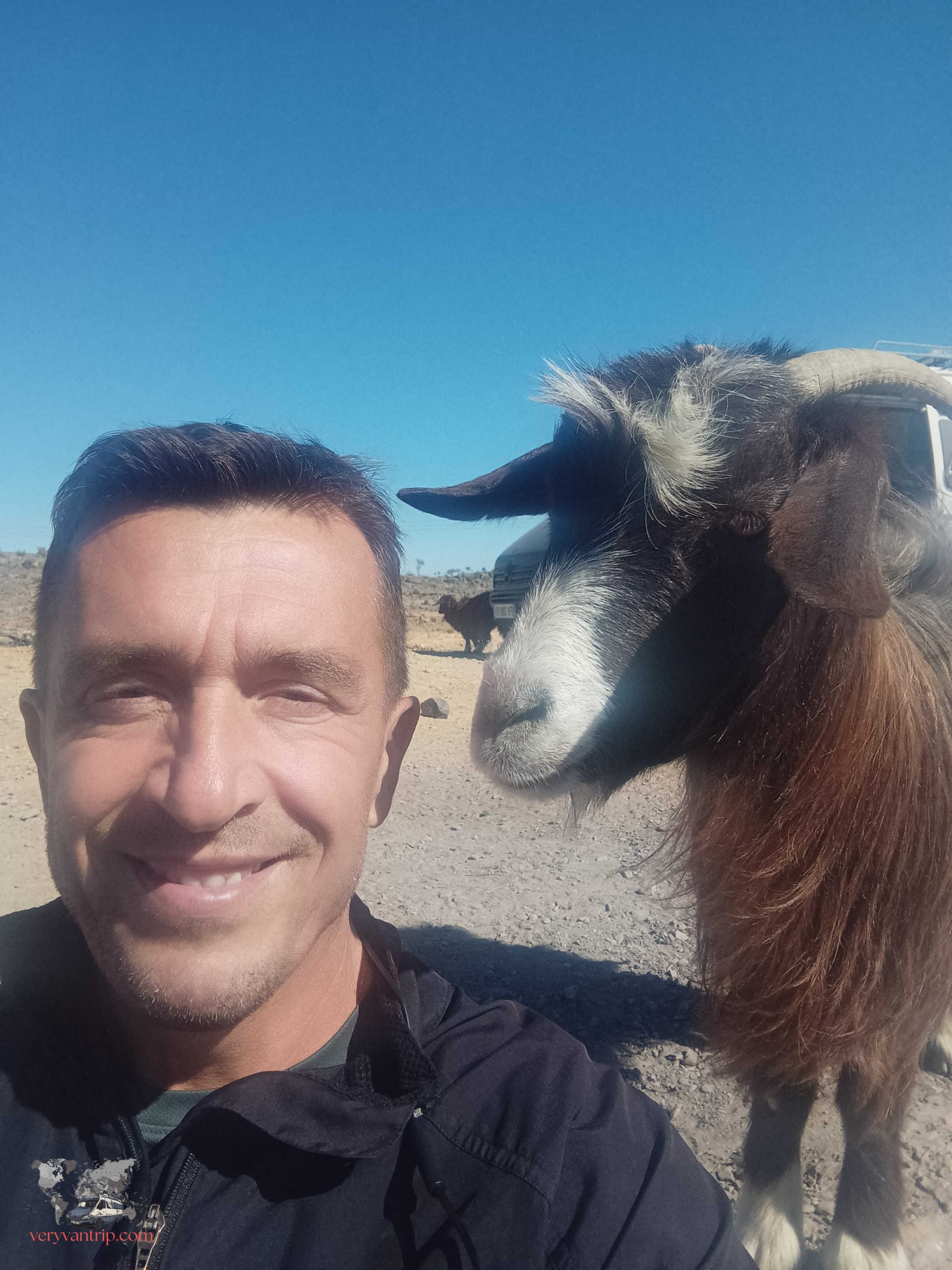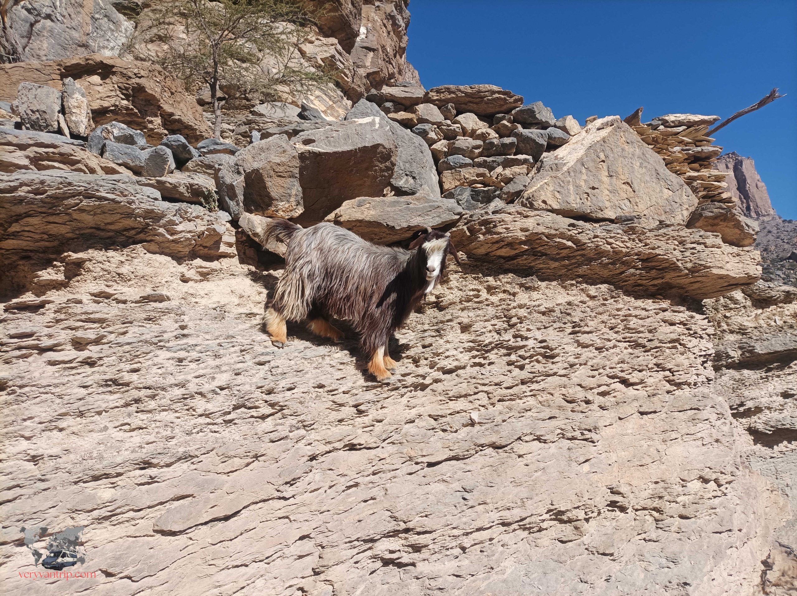 Impossible de parler des montagnes omanaises sans évoquer le Jebel Shams, le sommet le plus célèbre du nord du pays. La piste pour y accéder est parfois exigeante, mais après notre passage à Musandam, notre fourgon commence à s’habituer à ces montées spectaculaires. Une fois arrivés en haut, le panorama est à la hauteur de l’effort. Et comme souvent dans ces montagnes, nous ne sommes pas seuls. Quelques chèvres, visiblement très curieuses, viennent nous observer de près.