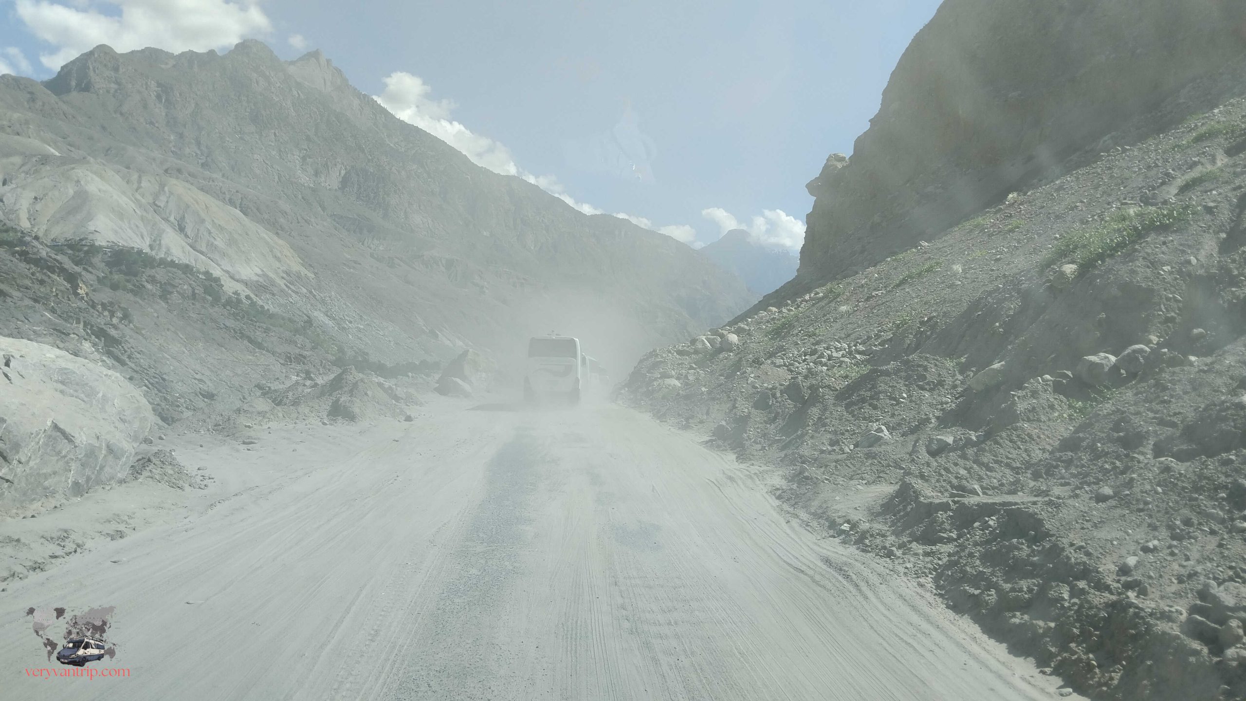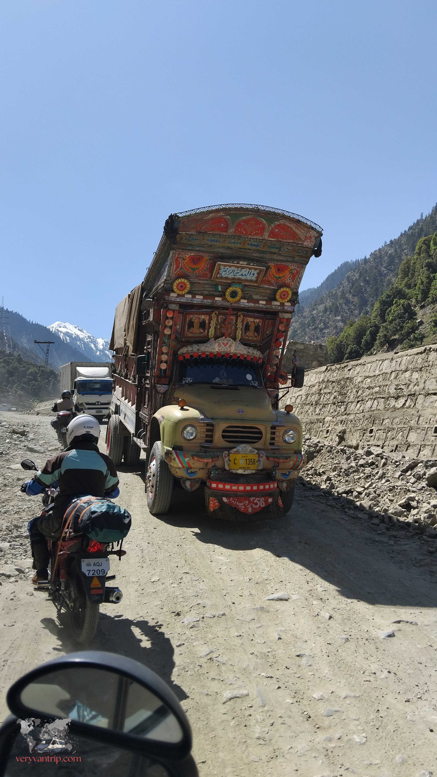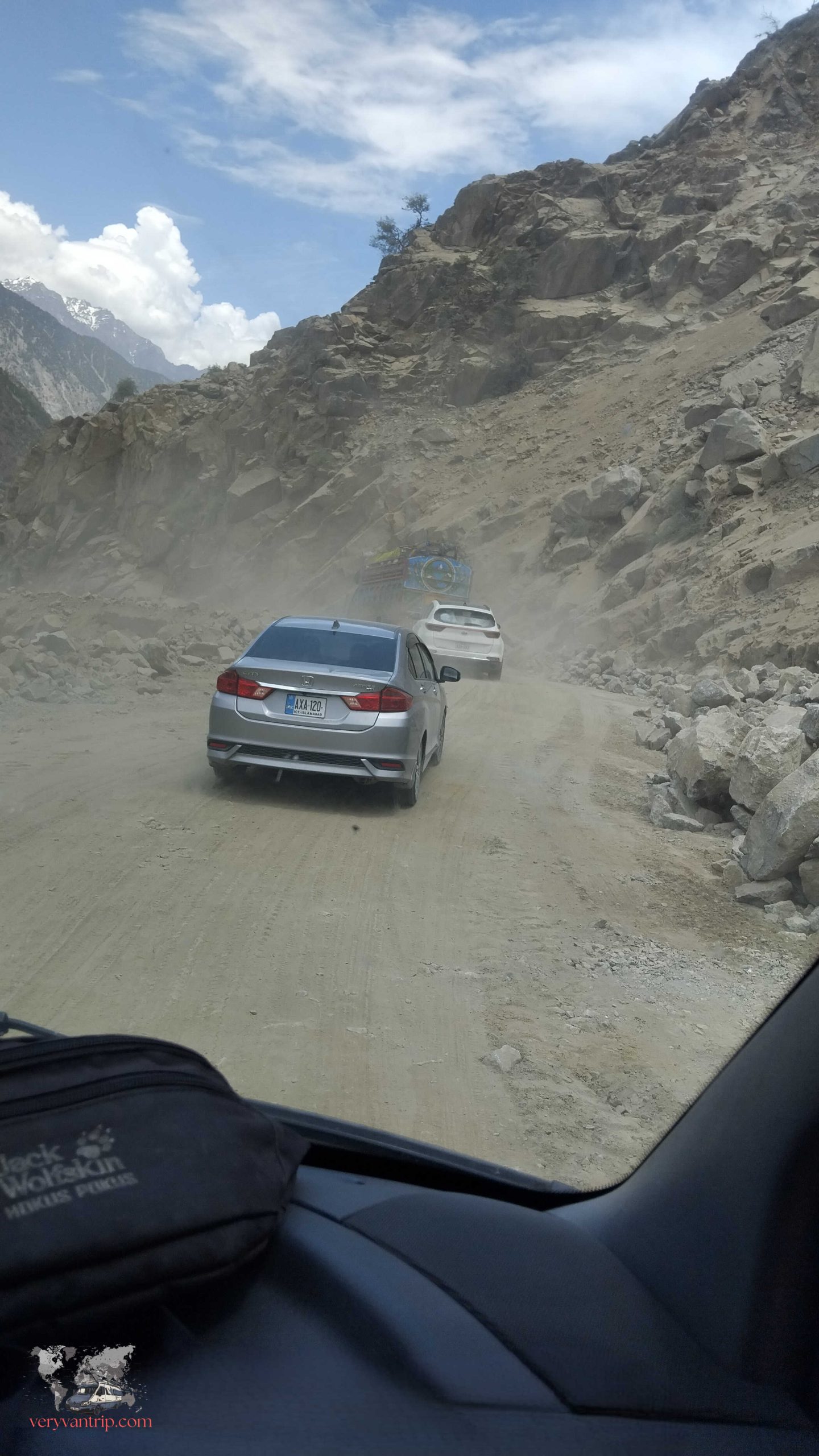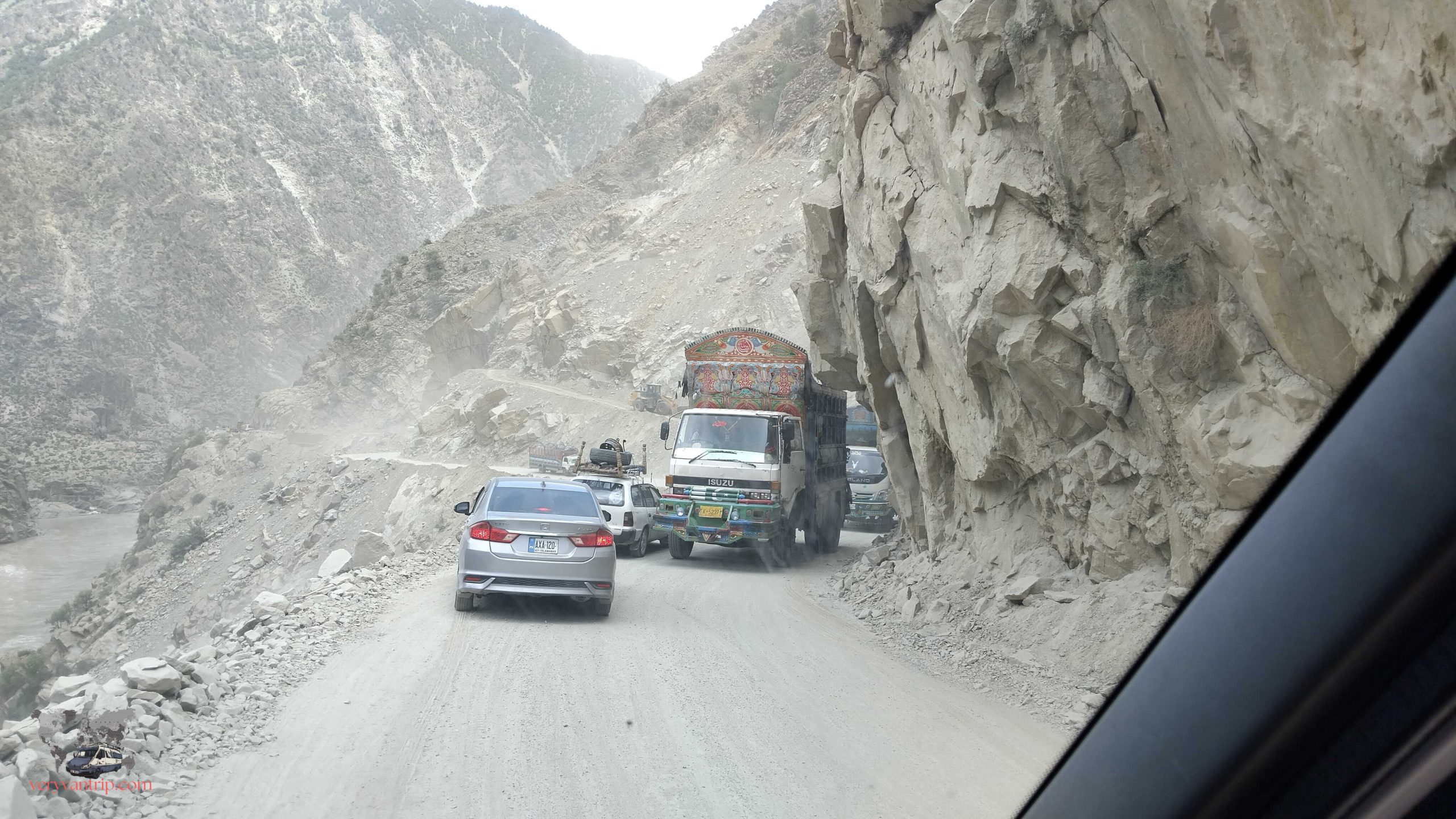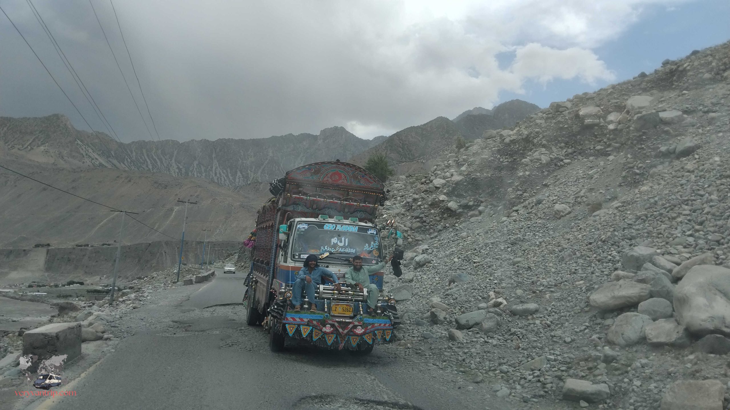 L’autoroute du Karakorum est l’une des routes les plus spectaculaires et les plus aventureuses du Pakistan. Depuis 1978, elle relie la Chine et le Pakistan sur environ 1300 kms, en traversant la chaine de montagnes du Karakorum à une altitude maximale de 4714 mètres au Khunjerab pass, la frontière avec la Chine. En raison des importants travaux de construction et des grandes hauteurs qu’elle traverse, la KKH est parfois surnomée la huitième merveille du monde, mais aussi car elle se faufile entre une multitude de montagnes allant de 4000 à 8000 mètres. Après être revenus de Chitral et repassés par la vallée de Swat, nous commençons notre première étape sur cette route mythique. Cela commence par des vues splendides, cependant, le terme « Highway » crée une fausse impression. Sur plusieurs kms la route ressemble à un chemin de terre, sur d’autres tronçons elle n’est qu’à voie unique et régulièrement la route est accidentée avec de grands trous dans l’asphalte. Encore une fois, si l’on pense européen et qu’on emprunte une autoroute on peut s’attendre à quelque chose de rapide, mais non car il nous faudra plus de deux jours pour faire les quelques 400 kms qui nous séparent de Gilgit notre prochaine destination.